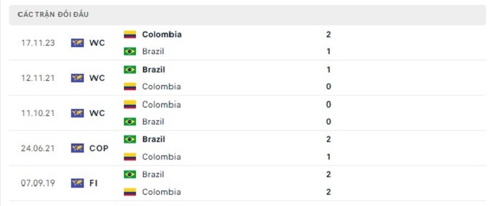 Phong độ gần đây Brazil vs Colombia