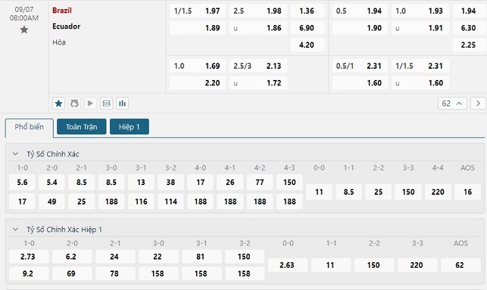 Bảng tỷ lệ kèo bóng đá trận đấu Brazil vs Ecuador