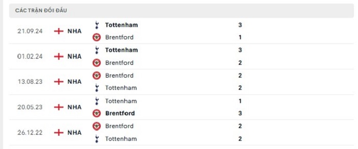 Bảng bóng đá trận đấu Brentford vs Tottenham