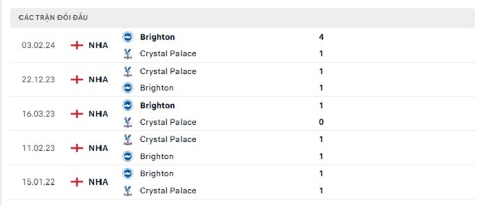 Lịch sử đối đầu của Brighton vs Crystal Palace