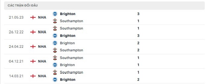Bảng bóng đá trận đấu Brighton vs Southampton