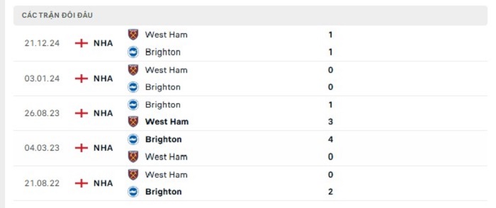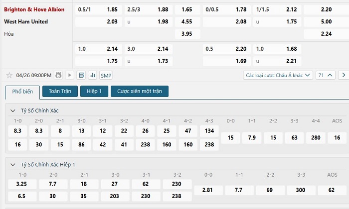 Bảng tỷ lệ kèo bóng đá trận đấu Brighton vs West Ham United
