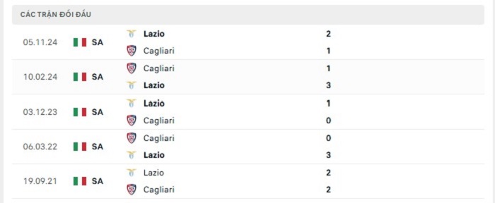 Lịch sử đối đầu của Cagliari vs Lazio