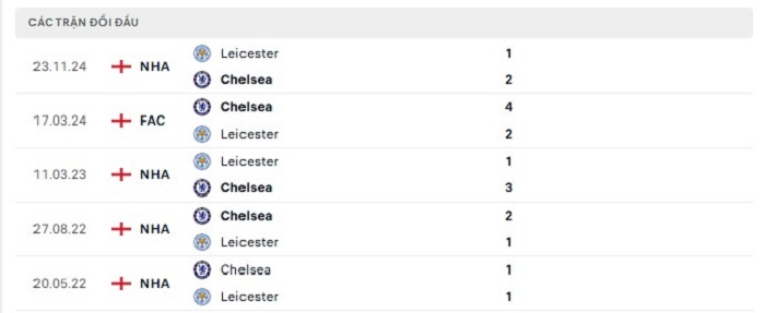 Lịch sử đối đầu của Chelsea vs Leicester City