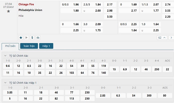 Bảng tỷ lệ kèo bóng đá trận đấu Chicago Fire vs Philadelphia Union