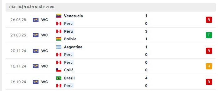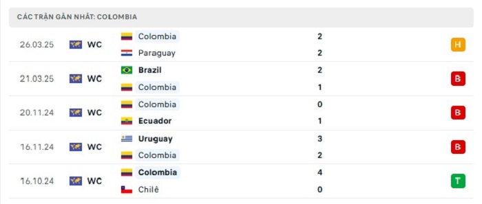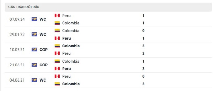 Phong độ gần đây Colombia vs Peru