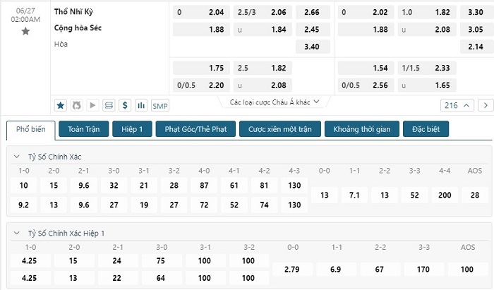 Bảng tỷ lệ kèo bóng đá trận đấu Cộng hoà Séc vs Thổ Nhĩ Kỳ