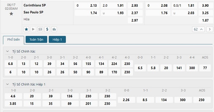 Bảng tỷ lệ kèo bóng đá trận đấu Corinthians vs Sao Paulo