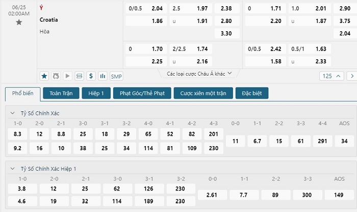 Bảng tỷ lệ kèo bóng đá trận đấu Croatia vs Ý