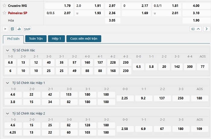 Bảng tỷ lệ kèo bóng đá trận đấu Cruzeiro vs Palmeiras