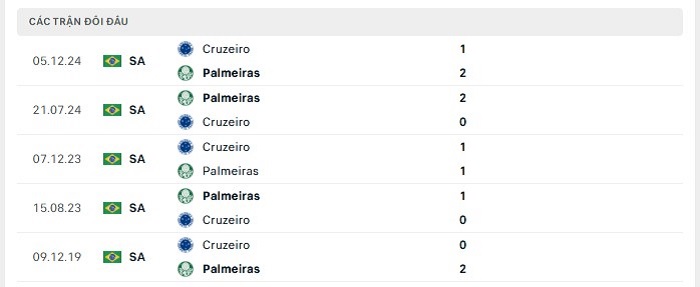Lịch sử đối đầu của Cruzeiro vs Palmeiras