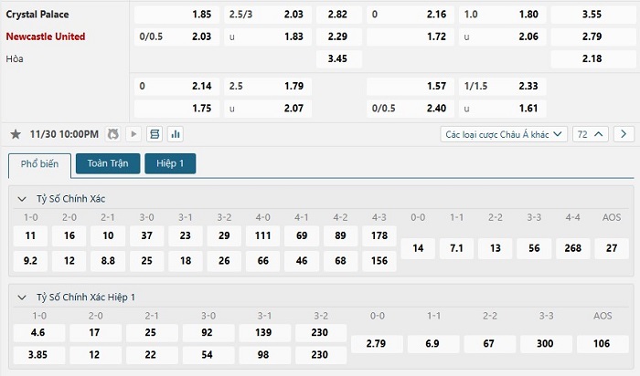 - Chọn Crystal Palace +0 (H1)