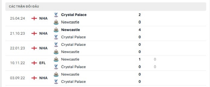 Bảng bóng đá trận đấu Crystal Palace vs Newcastle