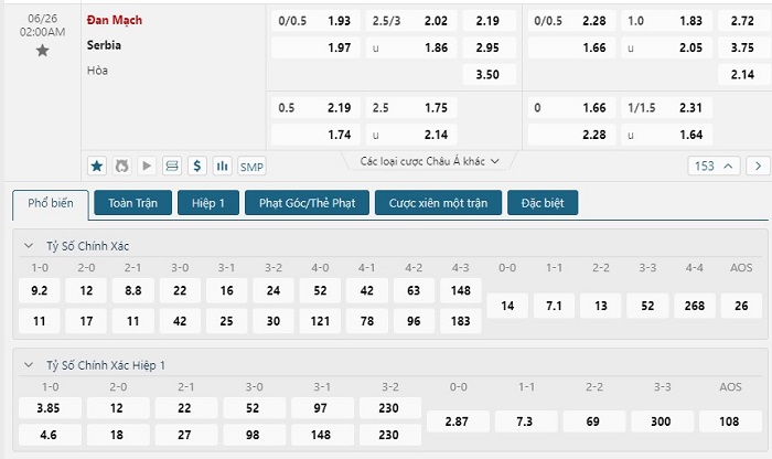 Bảng tỷ lệ kèo bóng đá trận đấu Đan Mạch vs Serbia