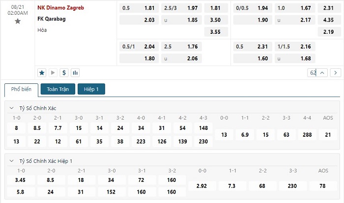Bảng tỷ lệ kèo bóng đá trận đấu Dinamo Zagreb vs Qarabag