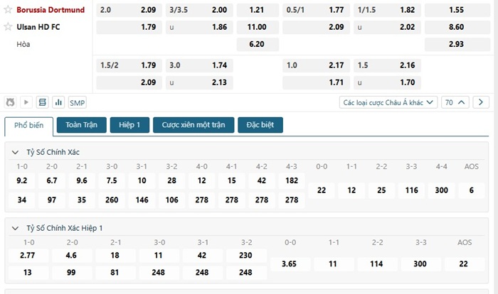 Bảng tỷ lệ kèo bóng đá trận đấu Dortmund vs Ulsan