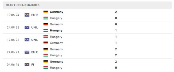 Trong những lần gặp nhau giữa Đức và Hungary gần đây tỷ lệ ghi bàn trong các trận đấu của họ cũng không thực sự cao, điều này có thể thấy được khi chỉ có duy nhất 1 trận đấu trong 7 lần gặp nhau có nhiều hơn 3 bàn thắng ghi được và có tới 5 trận đấu chỉ có từ 2 bàn thắng ghi được trở xuống, do vậy mà trận đấu sắp tới của hai đội cũng sẽ khó có thể kỳ vọng vào một trận đấu bùng nổ về mặt tỷ số của cả hai đội.