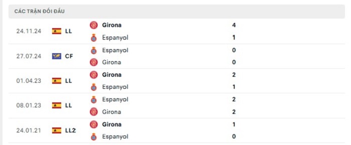 Lịch sử đối đầu của Espanyol vs Girona