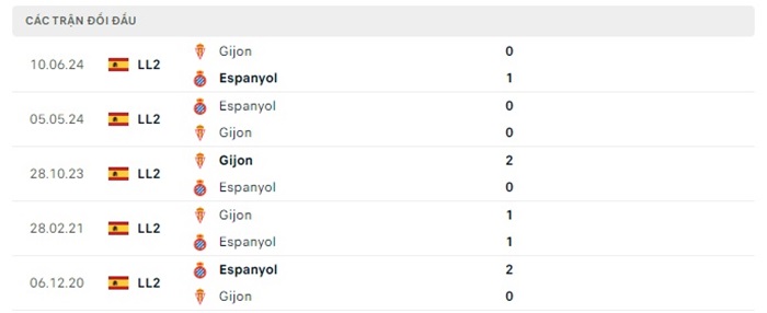 Lịch sử đối đầu của Espanyol vs Sporting Gijon