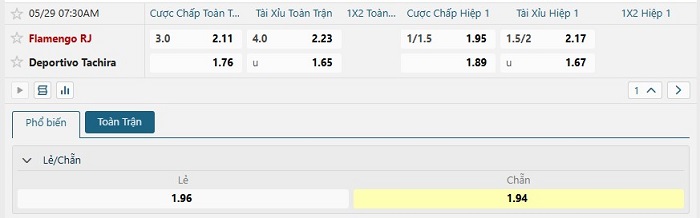 Bảng tỷ lệ kèo bóng đá trận đấu Flamengo vs Deportivo Tachira