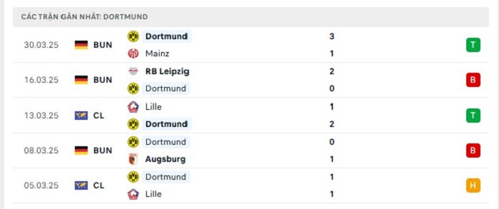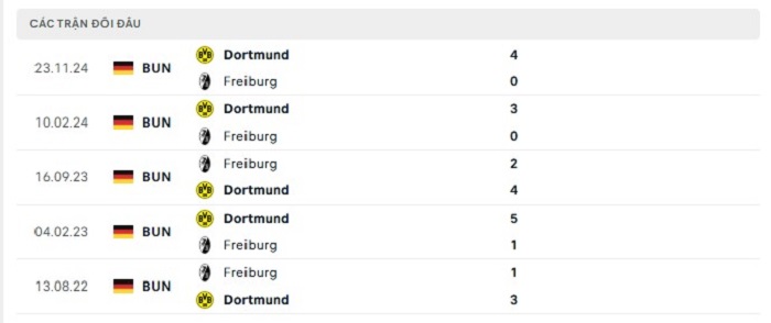 Phong độ gần đây Freiburg vs Borussia Dortmund