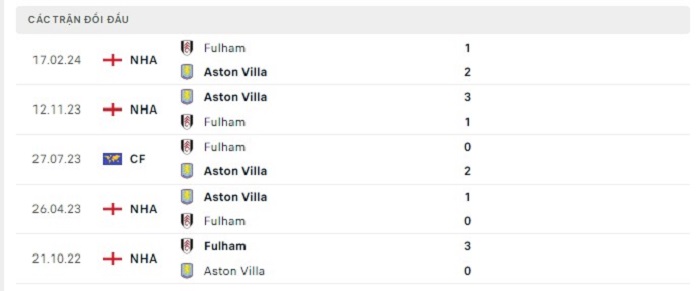 Bảng bóng đá trận đấu Fulham vs Aston Villa
