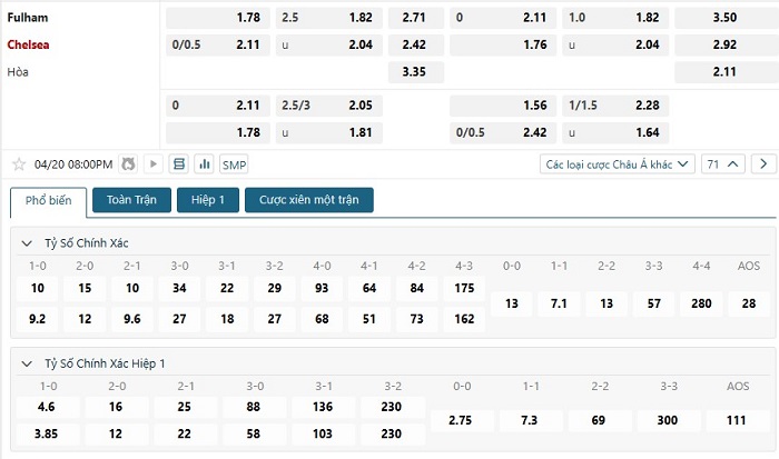Bảng tỷ lệ kèo bóng đá trận đấu Fulham vs Chelsea
