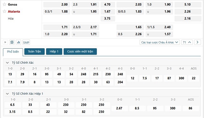 Bảng tỷ lệ kèo bóng đá trận đấu Genoa vs Atalanta
