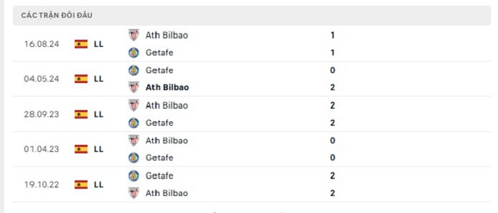 Lịch sử đối đầu của Getafe vs Atheltic Bilbao
