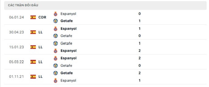 Phong độ gần đây Getafe vs Espanyol