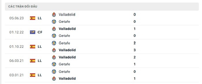 Lịch sử đối đầu của Getafe vs Real Valladolid