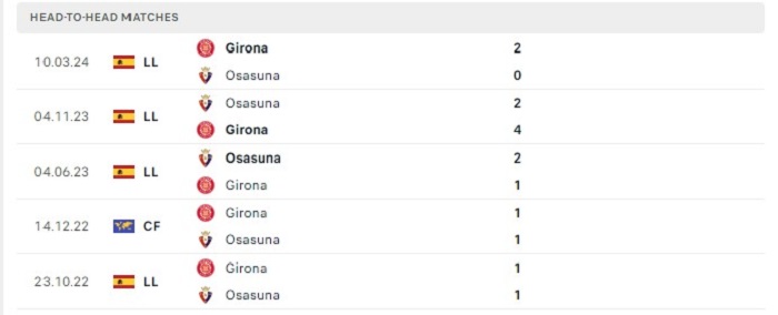 Quá khứ đang đứng về phía Girona khi họ có được thành tích đối đầu không tệ trước Osasuna, điều này cũng có thể nhận thấy được khi 8 lần đón tiếp Osasuna trên sân nhà gần đây Girona mới chỉ nhận 1 thất bại trước Osasuna trong khi có được 3 chiến thắng trước đối thủ này. Tại mùa giải trước phong độ trên sân nhà của Girona cũng đang cho thấy được sự ổn định rất đáng kể của mình, vì vậy mà khả năng thắng trận của họ càng trở nên khả thi hơn nhiều.