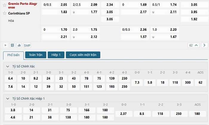 Bảng tỷ lệ kèo bóng đá trận đấu Gremio vs Corinthians