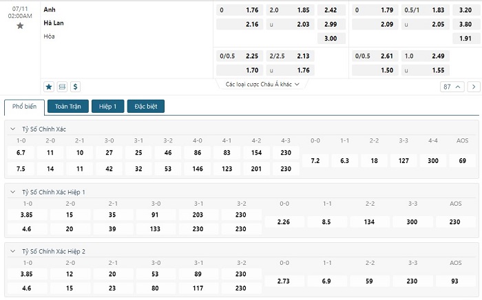 Bảng tỷ lệ kèo bóng đá trận đấu Hà Lan vs Anh