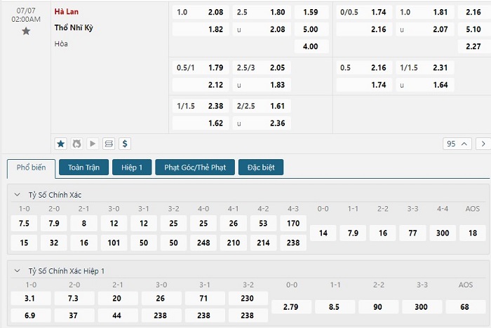 Bảng tỷ lệ kèo bóng đá trận đấu Hà Lan vs Thổ Nhĩ Kỳ