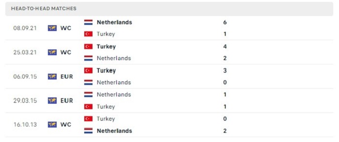Trong những năm qua Thổ Nhĩ Kỳ mặc dù có được sự tiến bộ nhưng họ vẫn còn có những điểm thua kém so với Hà Lan, thành tích quá khứ trong 7 lần gặp nhau gần đây Hà Lan cũng chiếm được ưu thế với 4 trận thắng và chỉ để thua 2. Trong 10 trận đấu gần đây nhất của mình Hà Lan cũng có tới 7 trận thắng kèo châu Âu cả trận có thể nhận thấy được phong độ ổn định của họ thời điểm hiện tại.