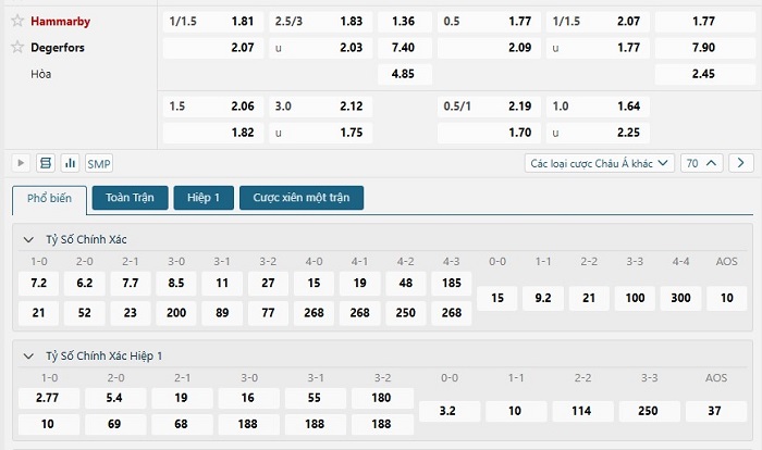 Bảng tỷ lệ kèo bóng đá trận đấu Hammarby vs Degerfors
