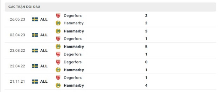 Lịch sử đối đầu của Hammarby vs Degerfors