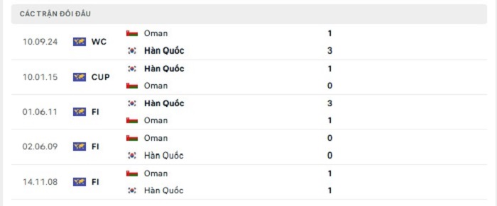 Với Hàn Quốc họ cũng đánh dấu được những thành công trước Oman ở những lần gặp nhau trước, tại 5 lần gặp nhau gần đây giữa hai đội thì đội tuyển xứ sở kim chi đang có được thành tích bất bại với 2 trận thắng kèo châu Âu và 3 trận hoà trước đối thủ này. Với sân nhà đang có được tại thời điểm hiện nay với Hàn Quốc họ cũng thể hiện được phong độ và sự ổn định đáng kể của mình, chính bởi vậy mà việc họ có được một thắng lợi theo kèo châu Âu cũng là điều nằm trong tầm tay của họ.