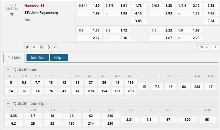 Bảng tỷ lệ kèo bóng đá trận đấu Hannover 96 vs Jahn Regensburg