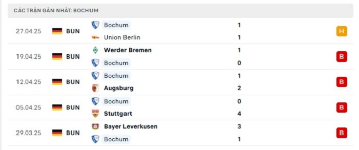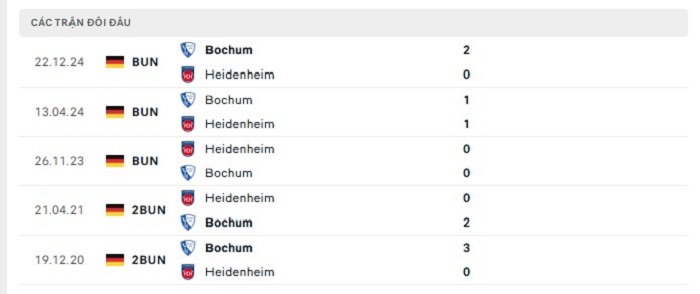 Lịch sử đối đầu của Heidenheim vs Bochum