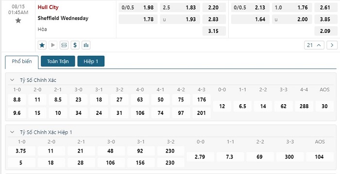Bảng tỷ lệ kèo bóng đá trận đấu Hull City vs Sheffield Wednesday
