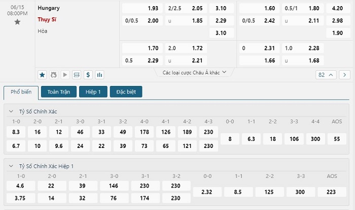 Bảng tỷ lệ kèo bóng đá trận đấu Hungary vs Thụy Sĩ