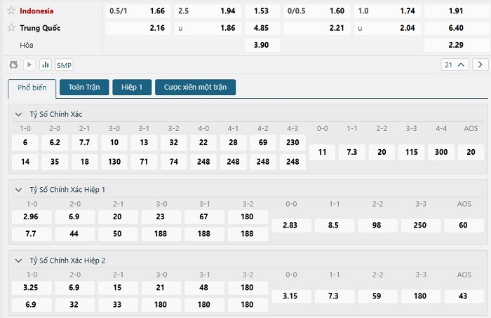 Bảng tỷ lệ kèo bóng đá trận đấu Indonesia vs Trung Quốc