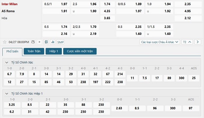 Bảng tỷ lệ kèo bóng đá trận đấu Inter Milan vs AS Roma