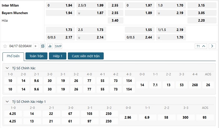 Bảng tỷ lệ kèo bóng đá trận đấu Inter Milan vs Bayern Munich
