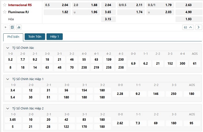 Bảng tỷ lệ kèo bóng đá trận đấu Internacional vs Fluminense