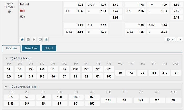 Bảng tỷ lệ kèo bóng đá trận đấu Ireland vs Anh