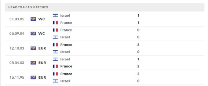 Tuyển Pháp sở hữu được thành tích bất bại của mình trước Israel trong nhiều năm qua, cụ thể là 5 trận gặp nhau gần đây nhất của mình Pháp có được 3 trận thắng kèo châu Âu trong khi chỉ hoà 2 trước đối thủ này. Ở thời điểm hiện tại của Israel họ đang thể hiện bộ mặt yếu kém ở sân chơi hiện tại của mình với 2 trận toàn thua theo mốc kèo châu Âu của trận đấu, vì vậy mà việc Israel có thể tạo nên được bất ngờ ở trận đấu sắp tới rất khó có thể kỳ vọng tới.