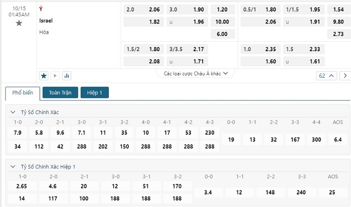 Soi kèo châu Á, kèo chấp Italia vs Israel